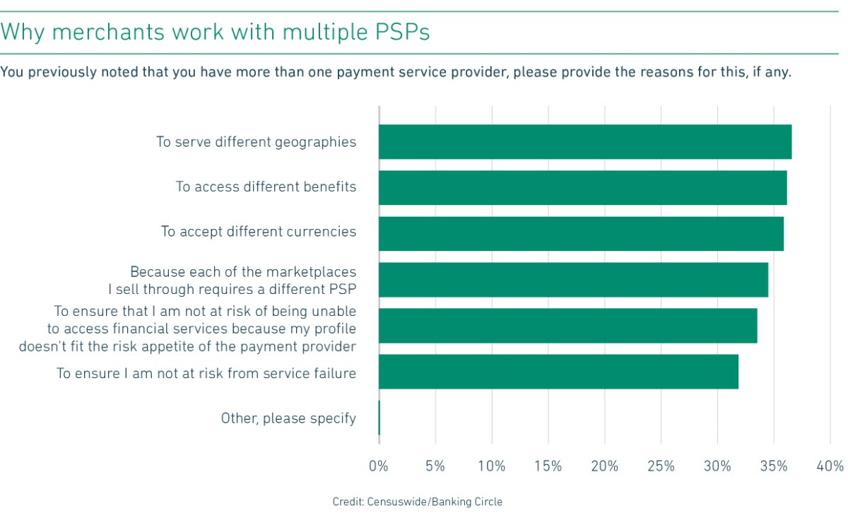 To enable smooth online purchases, 62% of merchants work with two or three PSPs, and two in three switch PSP once every two to three years. A quarter change provider every year. And the root causes of the use of multiple providers – despite the additional cost and management burden – appear to be centred around the need to work across borders.