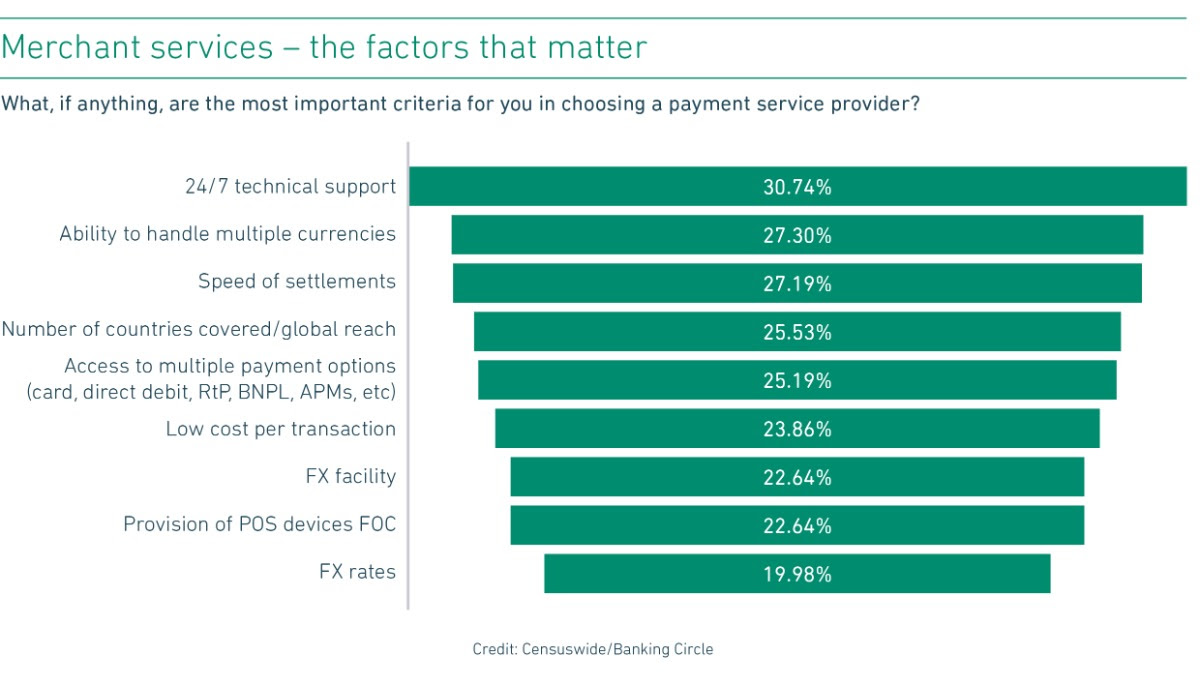 But multi-country and currency capabilities aren’t the only important factors for merchants in choosing their PSP partners. Underlining the significance of the ‘always on’ customer expectation at the heart of e-commerce, 31% of merchants said that having access to 24/7 technical support was the most important criteria. Ability to handle multiple currencies and speed of settlement came close second at 27% each.
