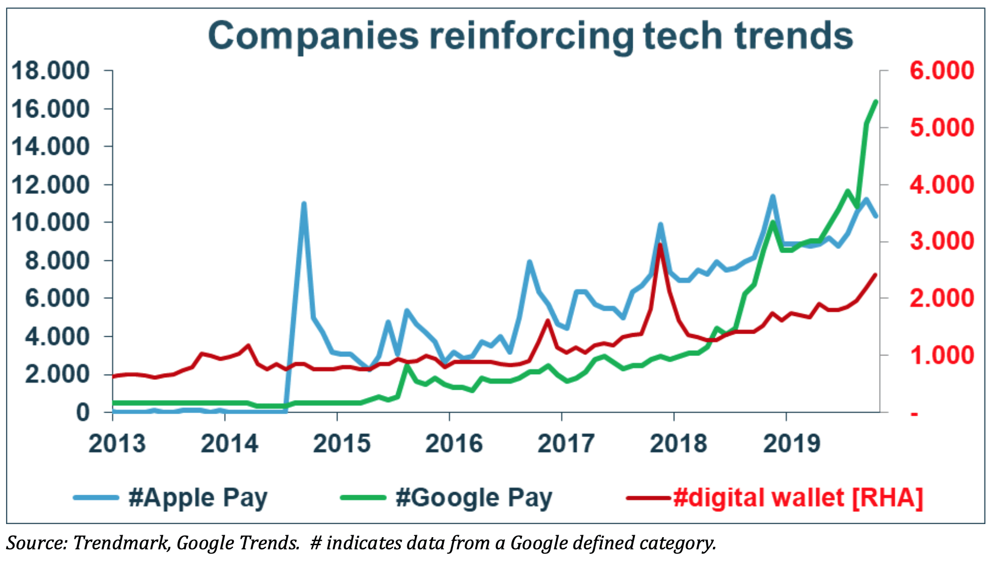 Interestingly, search for #digital wallets got a boost in right before the launch of #Apple Pay. The latter follows a launch-hype pattern in 2014, but it takes a few years before the uptrend starts. Only now #Apple Pay is making new highs. However, most the recent uptrend in #digital wallets was likely caused by the phenomenal growth of #Google Pay, which now ranks the highest search level of all digital wallet products. Although at 16.000 it is still below all search for Paypall (over 100.000) it is quite ahead of competitors such as Apple and #PhonePe at 3.800. BigTech does know how to show its “muscle”.