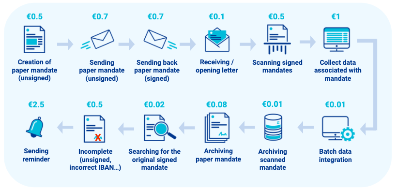 Handling paper mandates requires several manual steps, which is not only slower than a digital process, but it also multiplies costs. There are considerable savings that can be made from switching your offline mandate procedures to online. When comparing the costs of services associated with processing mandates offline with electronic mandate process, we estimate that up to €4.60 per mandate is saved with a 100% digital process.