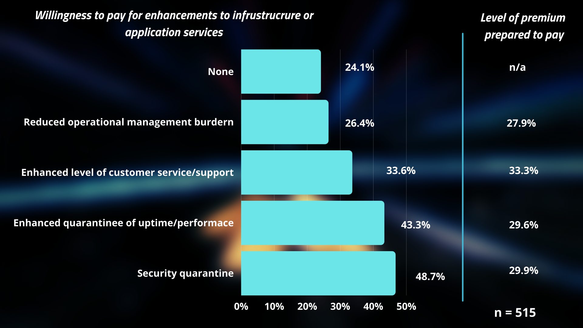 Surprisingly, up to 75% of respondents are willing to pay a premium for improvements to their hosting and cloud service. The most desired improvements are guarantees of security (48.7% of respondents) and service performance (43.3%) with less interest in paying service providers to take on the operational management burden (27.9%).