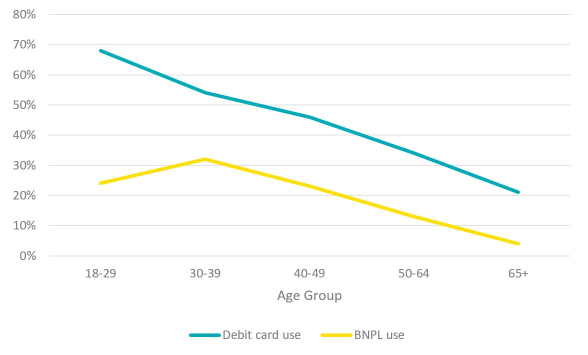 According to Worldpay, Australians made 10% of their ecommerce purchases via BNPL in 20203 – a figure that BNPL suppliers suggest could be much higher. However, as Figure 1 shows, this usage was not evenly distributed throughout the population, with BNPL enjoying disproportionate popularity amongst 18–39 year olds.