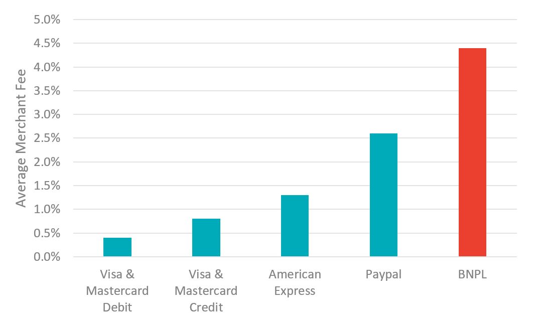 As BNPL steps in-store, however, its hybrid role as payment-method-turned-marketing-platform becomes increasingly difficult to reconcile. For example, CMSPI has observed instances of BNPL providers requiring merchants to enter unilateral agreements to accept their in-store cards – an arrangement that would be highly unusual with any traditional issuing bank. These unilateral agreements can place BNPL cards’ average acceptance fee significantly above other in-store options. Expansion from the checkout to the POS is therefore a significant concern for merchants, particularly for a payment method that’s already typically the most expensive to accept.