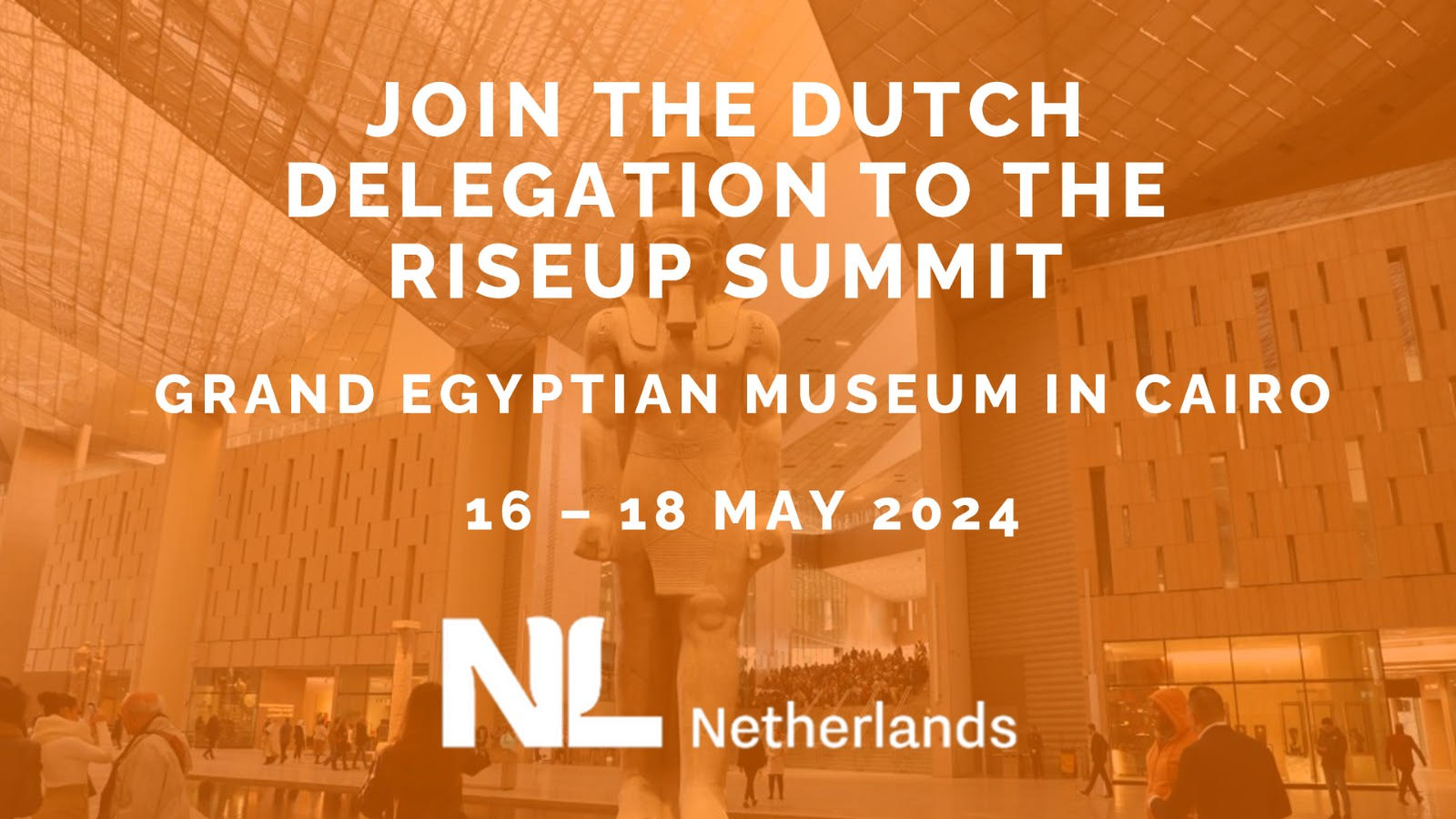 The summit will take place from May 16 to 18, 2024 at the Grand Egyptian Museum in Cairo. RiseUp Summit is the MENA region’s largest innovation and entrepreneurship summit, taking place in the heart of Cairo annually. It brings together startups, entrepreneurs, investors, and other stakeholders from the Middle East and North Africa (MENA) region and beyond. Join the Netherlands on this journey to Egypt, in the heart of the MENA region’s startup ecosystem!